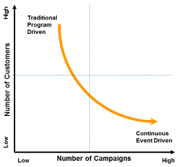 An effective event-driven contact approach has the potential to enable a business to utilise a combination of event triggers to identify, prioritise and conduct marketing. This involves a move from traditional marketing approach (infrequent mass marketing campaigns) to frequent and more precisely targeted campaigns delivered through “intelligent conversations”.